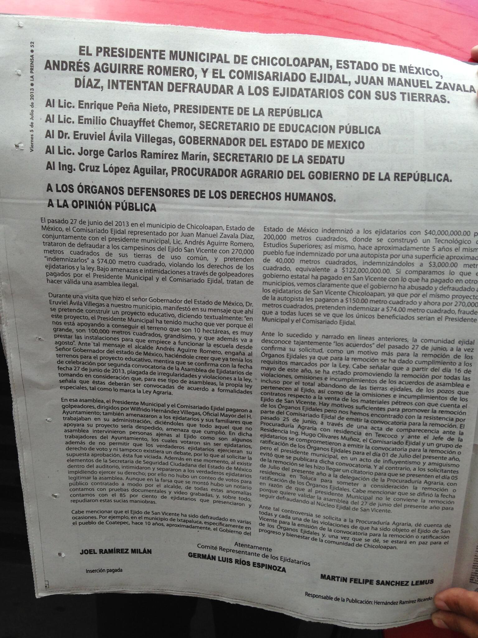 En Twitter mediante la cuenta @ejidatarios publicaron una foto de un desplegado en la prensa.