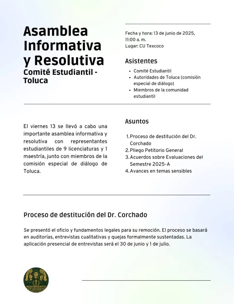 El viernes 13 de junio se llevó a cabo la Asamblea Informativa y Resolutiva entre el Comité Estudiantil CUTex y autoridades de Toluca.