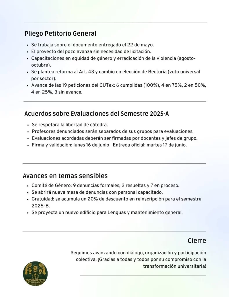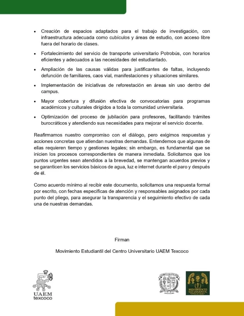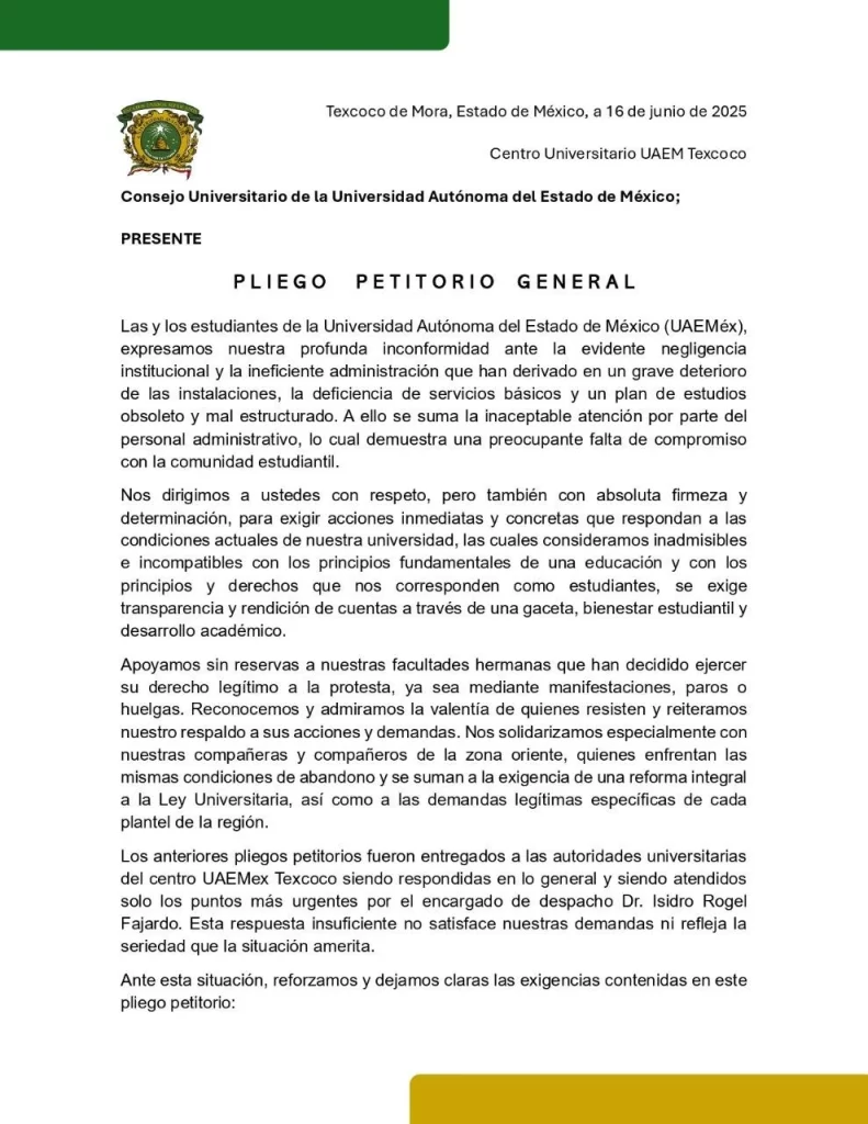 Después de sesiones abiertas, diagnósticos colectivos y la participación activa de estudiantes de todas las licenciaturas, compartimos públicamente el pliego petitorio general del movimiento estudiantil del Centro Universitario UAEM Texcoco.