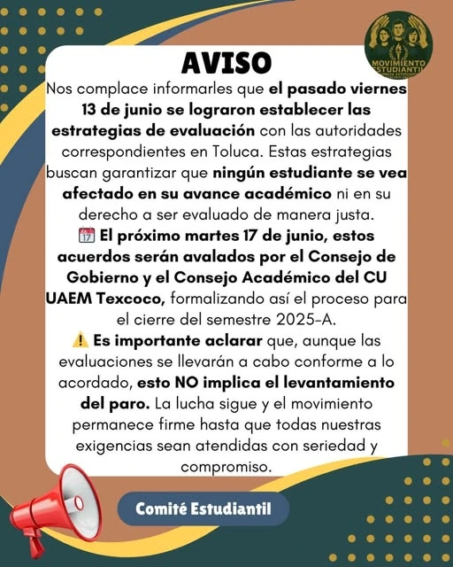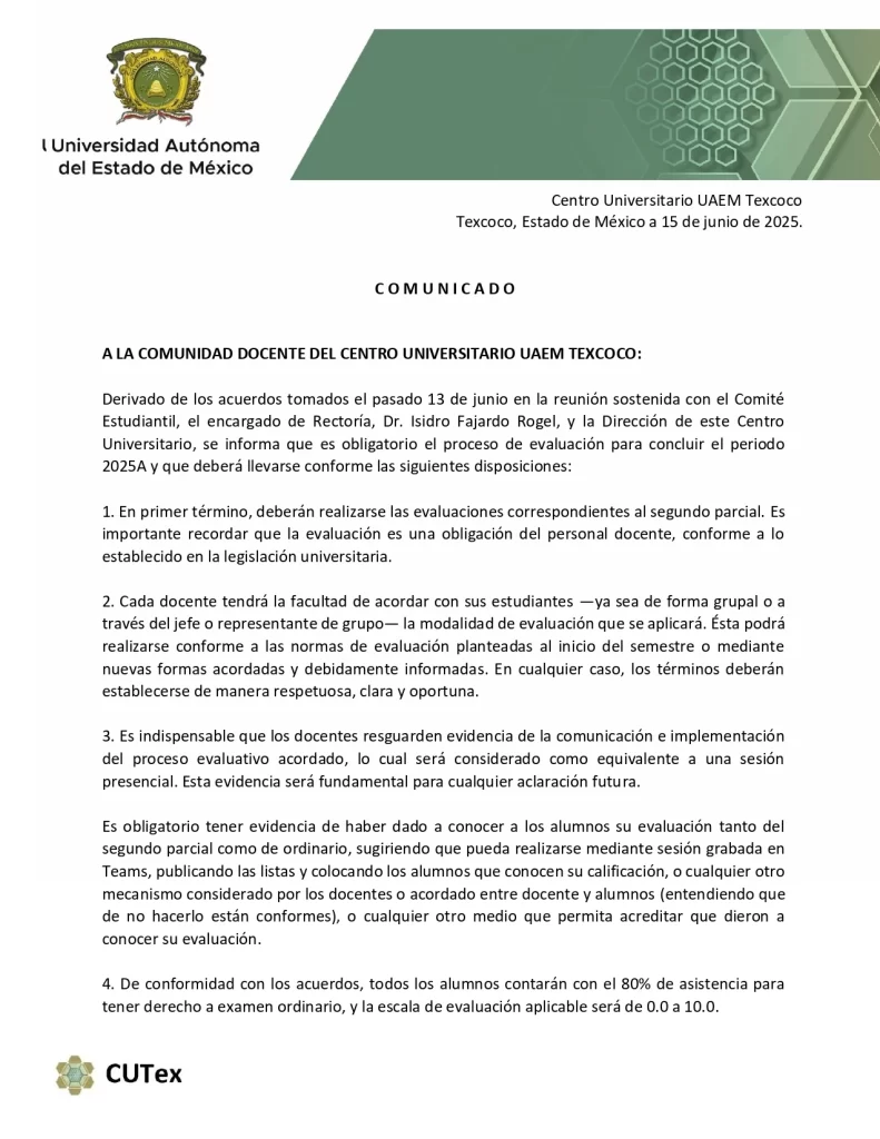 Tras un acuerdo, entre autoridades y estudiantes en paro, el Centro Universitario UAEM Texcoco realizará evaluaciones de fin de semestre, en ese contexto, el colectivo estudiantil da a conocer el pliego petitorio y los avances logrados tras el diálogo con las autoridades.