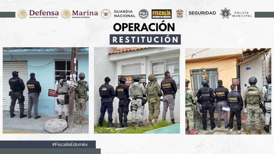 Operación “Restitución” forma parte de la “Estrategia para la Restitución de la Propiedad”, impulsada desde la Mesa de Coordinación para la Construcción de la Paz, que en la entidad encabeza la Gobernadora Delfina Gómez Álvarez, en sus acciones participan la DEFENSA, MARINA, GN, así como del Gobierno del Estado de México a través de la SSEM.