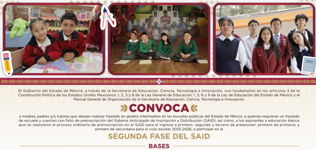 TOLUCA, Estado de México. – El Gobierno del Estado de México, a través de la Secretaría de Educación, Ciencia, Tecnología e Innovación (SECTI), activará del 7 al 27 de agosto de 2025 la segunda fase del Sistema Anticipado de Inscripción y Distribución (SAID), dirigida a aspirantes que no realizaron su preinscripción o requieren cambio de escuela.