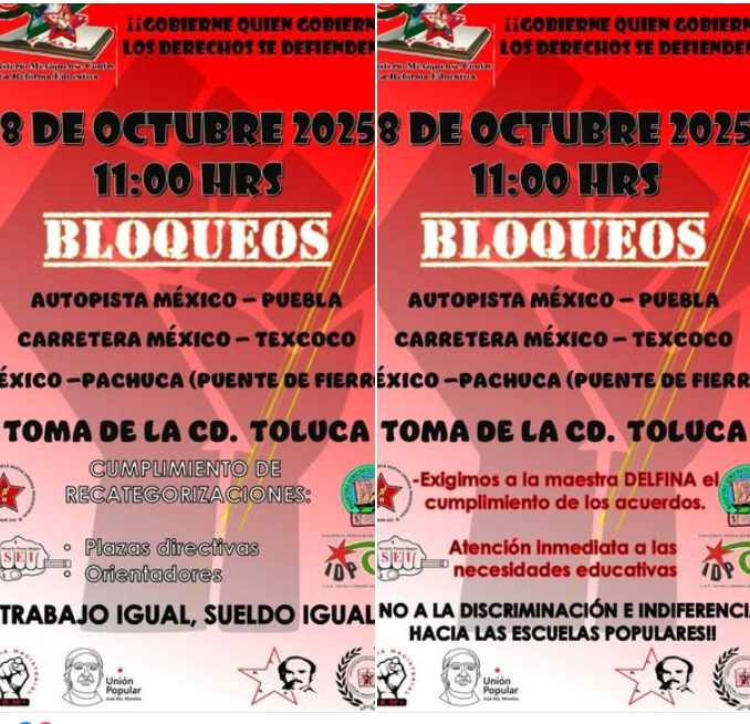 Varios grupos del magisterio estatal, organizados como MMCRE anuncian que harán bloqueo de varias vialidades el próximo 8 de Octubre, para el caso de Chicoloapan, PLENUM actuaría en la México – Texcoco, iniciarían a las 11 am.