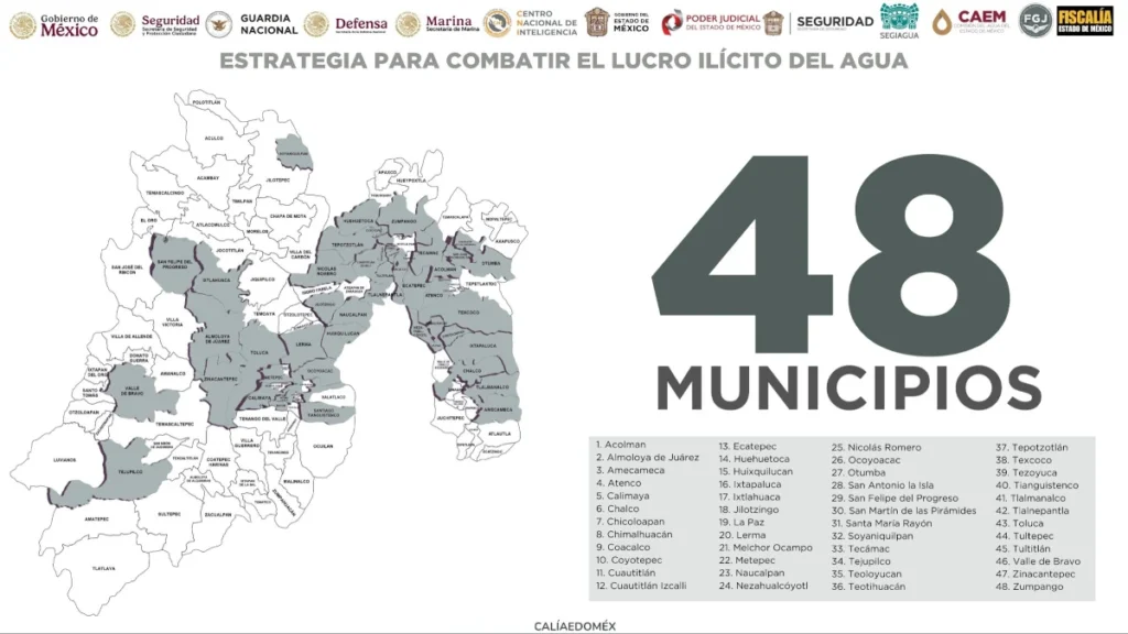 A través de la “Operación Caudal”, la #FiscalíaEdoméx @SSPCMexico, @Defensamx1, @SEMAR_mx, @GN_MEXICO_, @SS_Edomex, con apoyo de @Edomex , @conagua_mx, @CAEM_EDOMEX y organismos de agua municipales han intervenido más de 160 sitios relacionados con la extracción, sobre explotación y distribución ilegal del líquido vital.