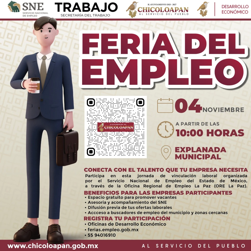 El próximo 4 de noviembre se llevará a cabo una Feria de Empleo en la explanada municipal de Chicoloapan iniciando a las 10 am, esto gracias a que la Secretaría del Trabajo eligió a nuestro municipio como sede.