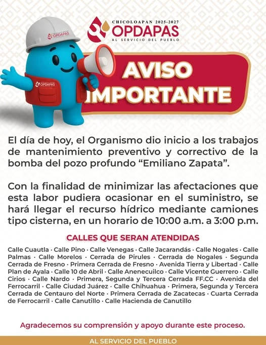 Por medio de facebook, OPDPAS Chicoloapan que desde ayer realizan acciones de mantenimiento en el pozo profundo “Emiliano Zapata”, no especifican cuanto tiempo durará, pero dicen que ofrecerán apoyo mediante pipas…
