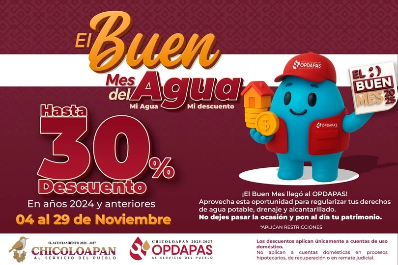 OPDAPAS Chicoloapan informó que inició el programa de regularización denominado “el buen mes del agua”, en el cual ofrecen descuentos de hasta un 30%. Se realizará del 4 al 29 de Noviembre. Lo detallan de la siguiente manera: