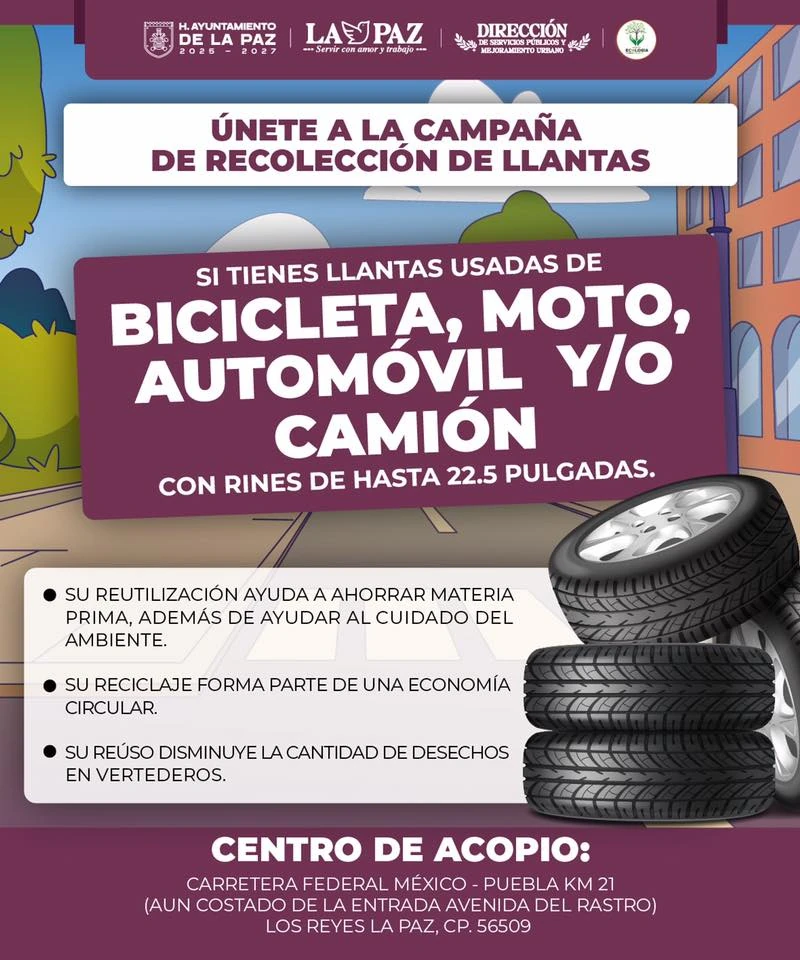 Si tienes varias llantas que ya no sirvan, puede llevarlas al municipio de La Paz, ahí hay un centro de acopio, en el caso de Chicoloapan no tenemos información sobre la existencia de algún lugar así, salvo uno que aparece cuando el Gobierno municipal necesita simular que hay centro de acopio, pero ese es otro tema, a continuación el boletín que emite el gobierno estatal y al final el cartel que difunde el municipio de la Paz para hacer acopio de llantas. Por cierto, antes había un centro de acopio en Texcoco, sobre la México – Texcoco antes de llegar a Chapingo, pero se desconoce si aún este en funciones.