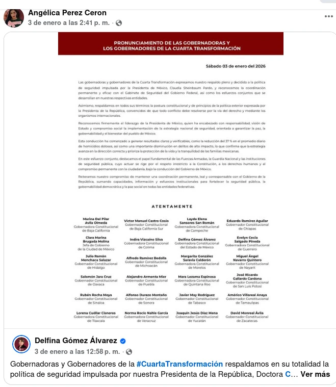 La Diputada plurinominal Angélica Pérez compartió dos publicaciones, en la primera, no comenta ni emite una postura, solo comparte el pronunciamiento de los gobernadores