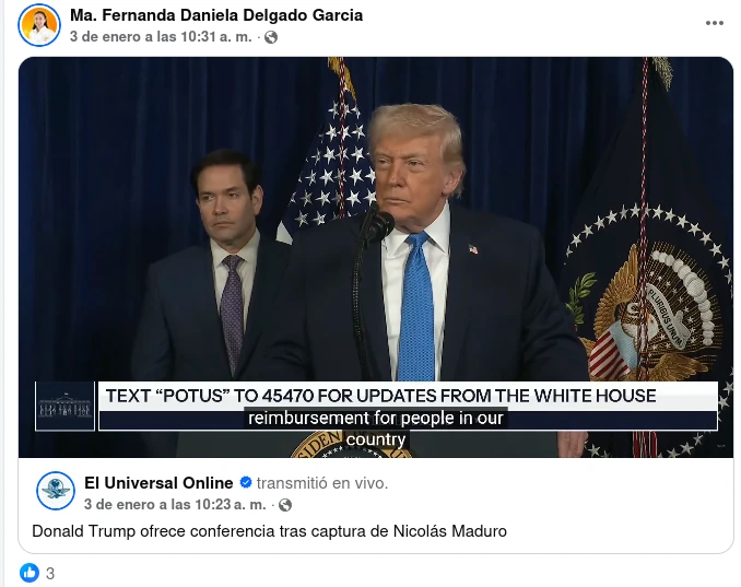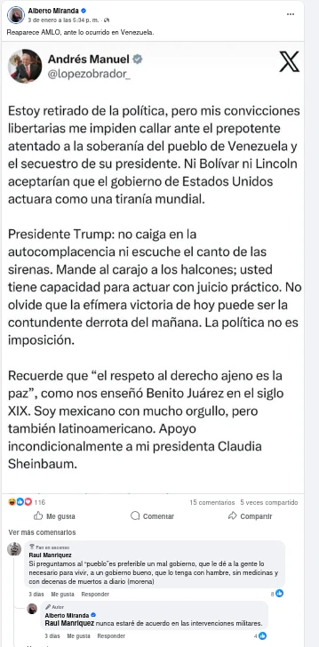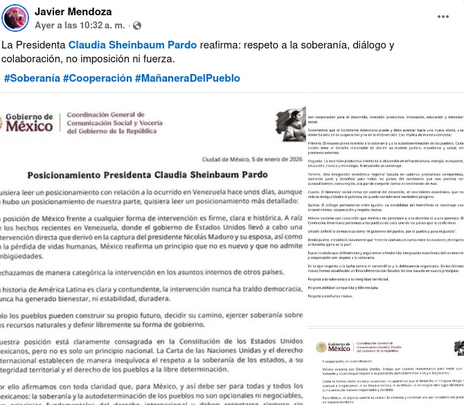 El Gobierno de México condena y rechaza enérgicamente las acciones militares ejecutadas unilateralmente en las últimas horas por fuerzas armadas de los Estados Unidos de América contra objetivos en territorio de la República Bolivariana de Venezuela, en clara violación del artículo 2 de la Carta de la Organización de las Naciones Unidas (ONU).