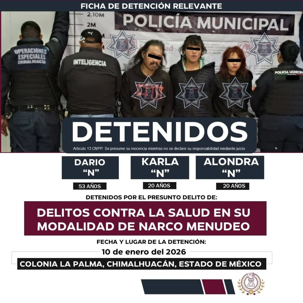 Las personas, identificadas como Alondra “N”, Karla “N” y Darío “N”, fueron aseguradas conforme a la ley y presentadas ante la Fiscalía General de Justicia del Estado de México, instancia que definirá su situación legal. Además, se investiga su posible relación a un triple homicidio registrado en diciembre de 2025 en los límites con San Vicente Chicoloapan.