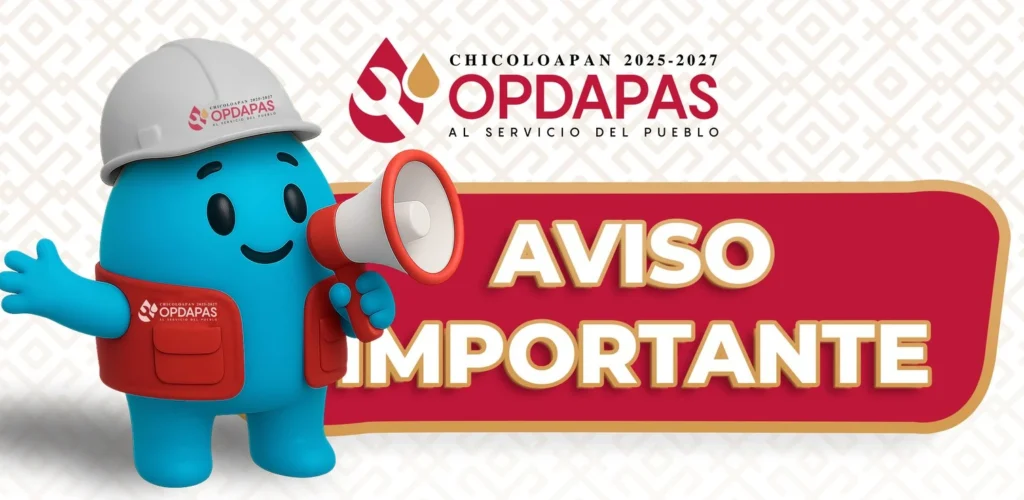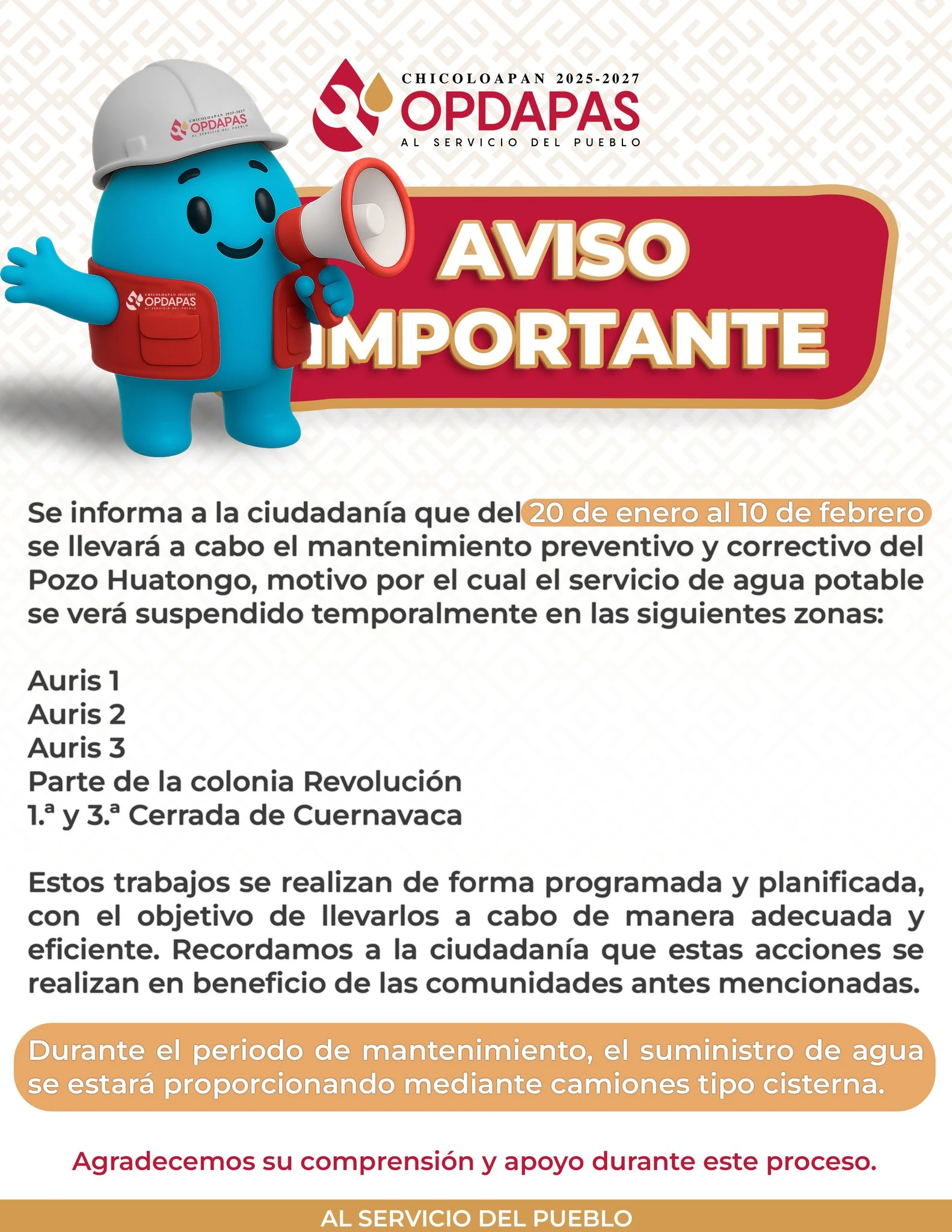 OPDAPAS Chicoloapan informó que del 20 de enero al 10 de febrero realizarán mantenimiento preventivo y correctivo del pozo Huatongo, debido a ello, suspenderán el servicio de agua potable en Auris 1, 2 y 3, así como parte de la Colonia Revolución.